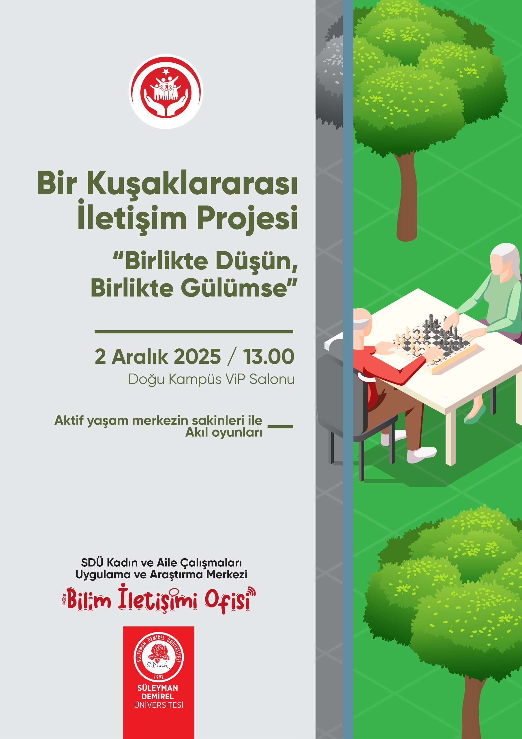 “Ailemizin Bilgeleri Aktif Yaşıyor” toplumsal katkı projemizin 3.Etabı 2 Aralık Doğu Kampüsü VIP salonunda gerçekleştirilecek. Müdür yardımcımız Doç. Dr. Zişan KORKMAZ ÖZCAN tarafından yürütülen projede aktif yaşam merkezi sakinleri ile çeşitli akıl oyunları oynanacak.