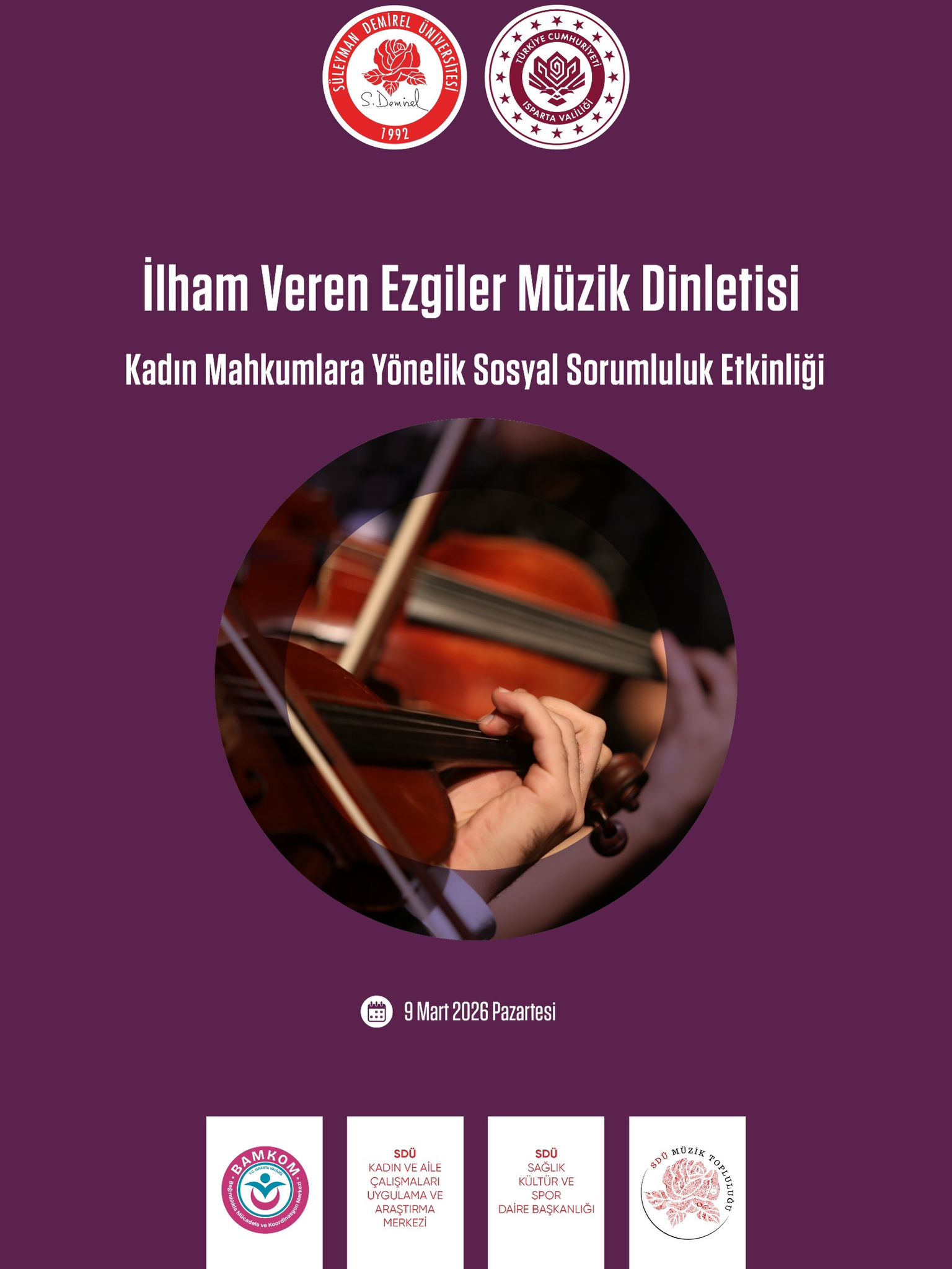 8 Mart Dünya Kadınlar Günü kapsamında BAMKOM, SDÜ Kadın ve Aile Çalışmaları Uygulama ve Araştırma Merkezi, SDÜ Sağlık, Kültür ve Spor Daire Başkanlığı ve SDÜ Müzik Topluluğu iş birliğiyle gerçekleşecek.