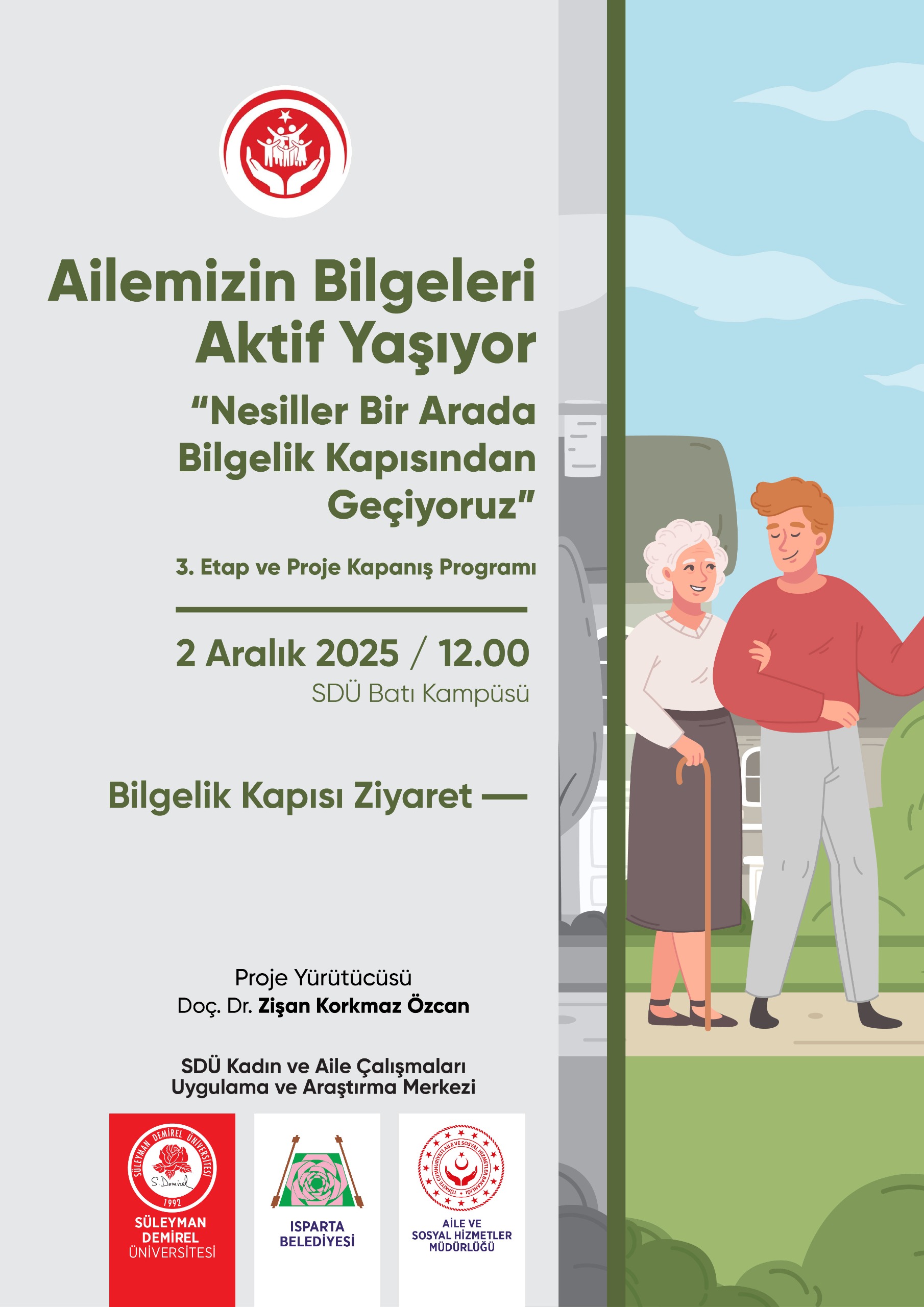“Ailemizin Bilgeleri Aktif Yaşıyor” toplumsal katkı projemizin 3.Etap proje kapanış programı 2 Aralık SDÜ Batı Kampüsünde gerçekleştirilecek. Müdür yardımcımız Doç. Dr. Zişan KORKMAZ ÖZCAN tarafından yürütülen projede kuşaklararası iletişimin güçlendirilmesi hedefleniyor. Katılımcılar ile Bilgelik Kapısı Ziyareti gerçekleştirilecek.